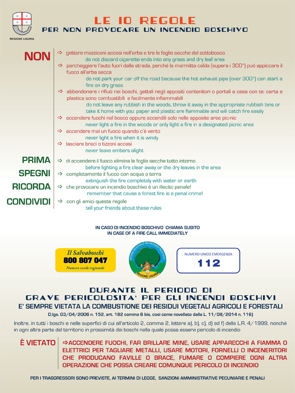 Regione Liguria [fusion_builder_container hundred_percent="no" hundred_percent_height="no" hundred_percent_height_scroll="no" hundred_percent_height_center_content="yes" equal_height_columns="no" menu_anchor="" hide_on_mobile="small-visibility,medium-visibility,large-visibility" class="" id="" background_color="" background_image="" background_position="center center" background_repeat="no-repeat" fade="no" background_parallax="none" enable_mobile="no" parallax_speed="0.3" video_mp4="" video_webm="" video_ogv="" video_url="" video_aspect_ratio="16:9" video_loop="yes" video_mute="yes" video_preview_image="" border_size="" border_color="" border_style="solid" margin_top="" margin_bottom="" padding_top="" padding_right="" padding_bottom="" padding_left="" admin_toggled="no"][fusion_builder_row][fusion_builder_column type="1_1" layout="1_1" spacing="" center_content="no" link="" target="_self" min_height="" hide_on_mobile="small-visibility,medium-visibility,large-visibility" class="" id="" background_color="" background_image="" background_position="left top" background_repeat="no-repeat" hover_type="none" border_size="0" border_color="" border_style="solid" border_position="all" padding_top="" padding_right="" padding_bottom="" padding_left="" dimension_margin="" animation_type="" animation_direction="left" animation_speed="0.3" animation_offset="" last="no"][fusion_separator style_type="shadow" hide_on_mobile="small-visibility,medium-visibility,large-visibility" class="" id="" sep_color="" top_margin="" bottom_margin="" border_size="" icon="" icon_circle="" icon_circle_color="" width="" alignment="center" /][/fusion_builder_column][/fusion_builder_row][/fusion_builder_container] Il 4 agosto 2018 è stato decretato lo stato di grave pericolosità per incendi boschivi su tutto il territorio della Regione Liguria: a causa delle condizioni climatiche e della particolare secchezza del terreno e della vegetazione è vietato accendere qualsiasi tipo di fuoco e usare attrezzature che possano provocare scintille. In caso di incendio boschivo occorre attivare subito il sistema regionale di intervento chiamando il numero unico di emergenza 112 o il numero verde regionale “il Salvaboschi” 800.80.70.47. Si raccomanda di seguire le 10 regole per non provocare un incendio boschivo:Per approfondire: