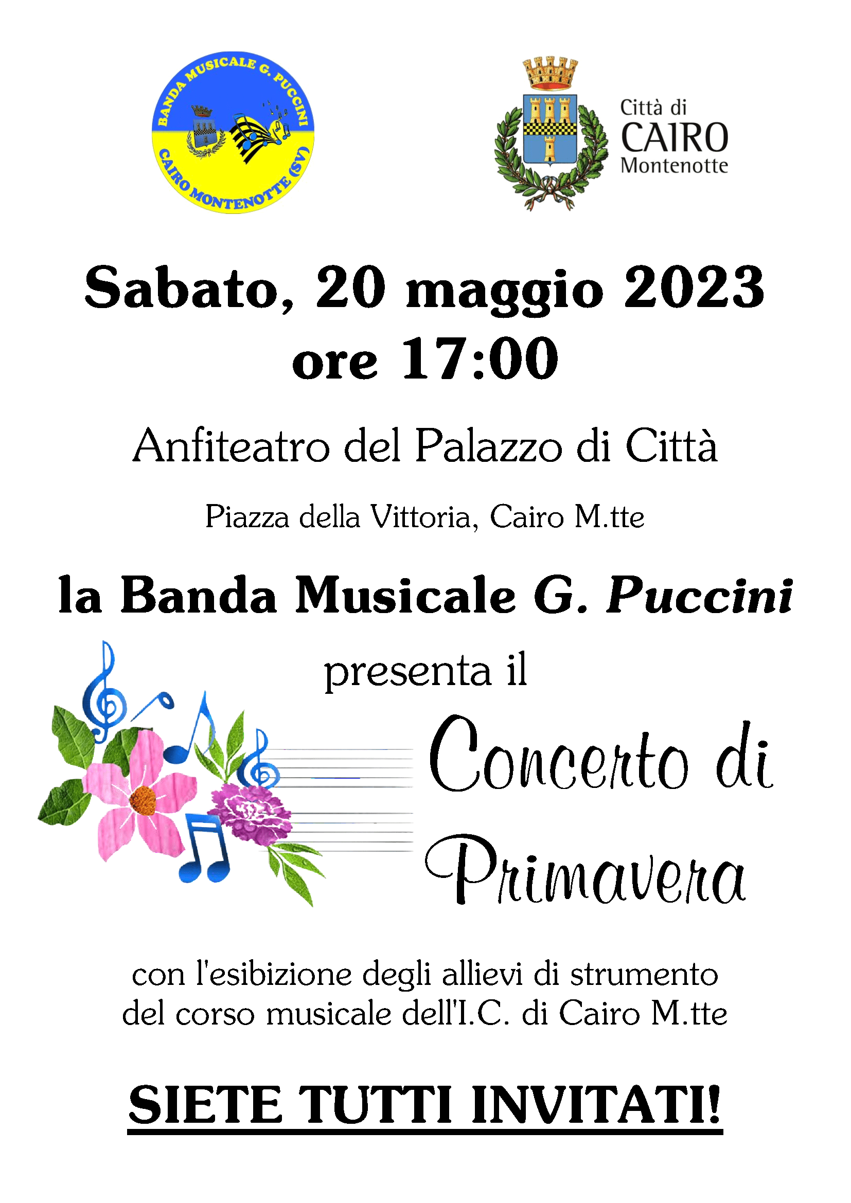 Dopo alcuni anni, la Banda musicale G. Puccini ripropone alla cittadinanza il Concerto di Primavera, che avrà luogo sabato, 20 maggio alle ore 17:00 presso l'Anfiteatro del Palazzo di Città di Cairo Montenotte. Durante il concerto, si esibiranno gli allievi del corso di strumento dell'I.C. di Cairo Montenotte. Vi aspettiamo numerosi!