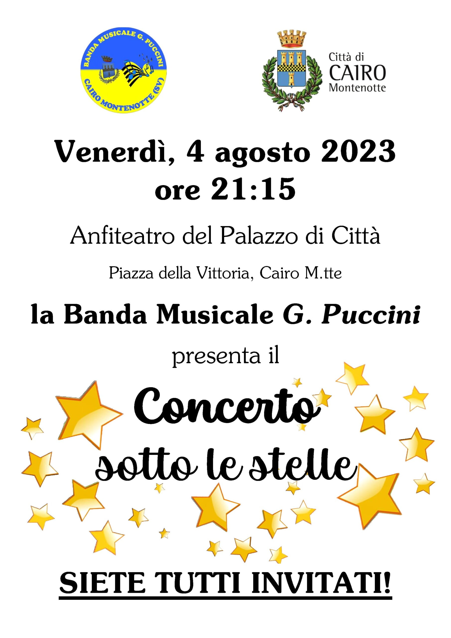 Venerdì, 4 agosto alle ore 21:15 nell'Anfiteatro del Palazzo di Città di Cairo Montenotte consueto appuntamento con il Concerto sotto le Stelle della Banda Musicale cittadina.