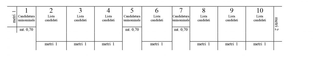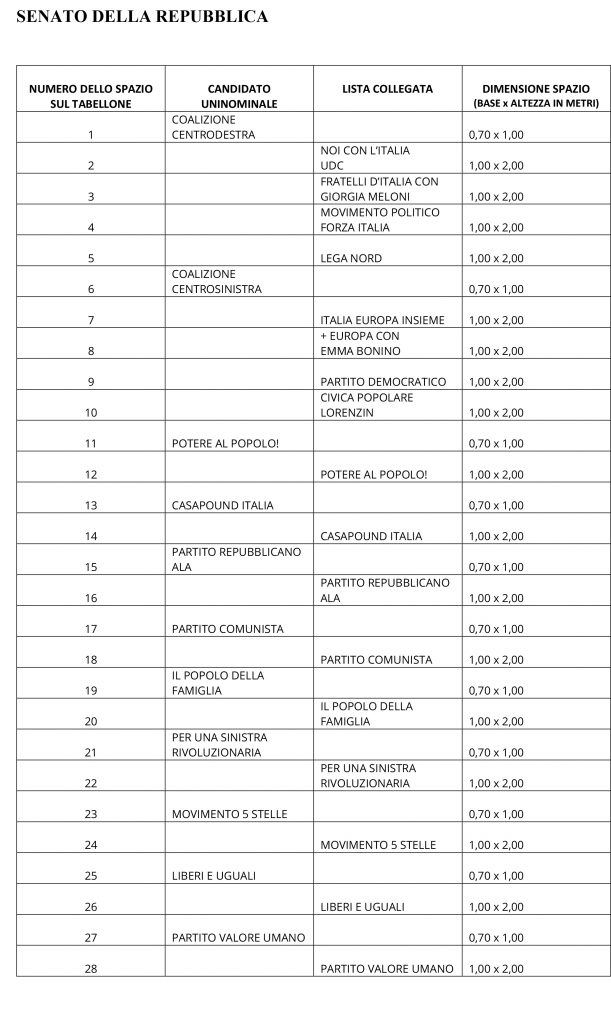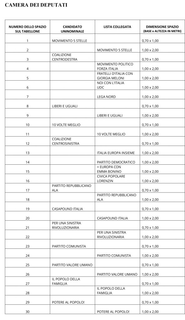 Per le sole elezioni politiche, il Ministero dell’Interno ha stabilito che gli spazi per la propaganda di ciascun candidato uninominale siano affiancati da quelli delle liste di candidati rispettivamente collegate secondo lo stesso ordine progressivo risultante dai sorteggi.
