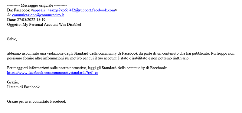 Giovedì 26 maggio Facebook ha disabilitato l’account istituzionale del Comune di Cairo Montenotte, impedendo, di fatto, ulteriori pubblicazioni sulla pagina ufficiale. Non ne conosciamo le ragioni, in risposta ad una richiesta di chiarimenti, ci è stato precisato che “è stata riscontrata una violazione degli Standard della community da parte di un contenuto pubblicato”, senza peraltro indicare quale.