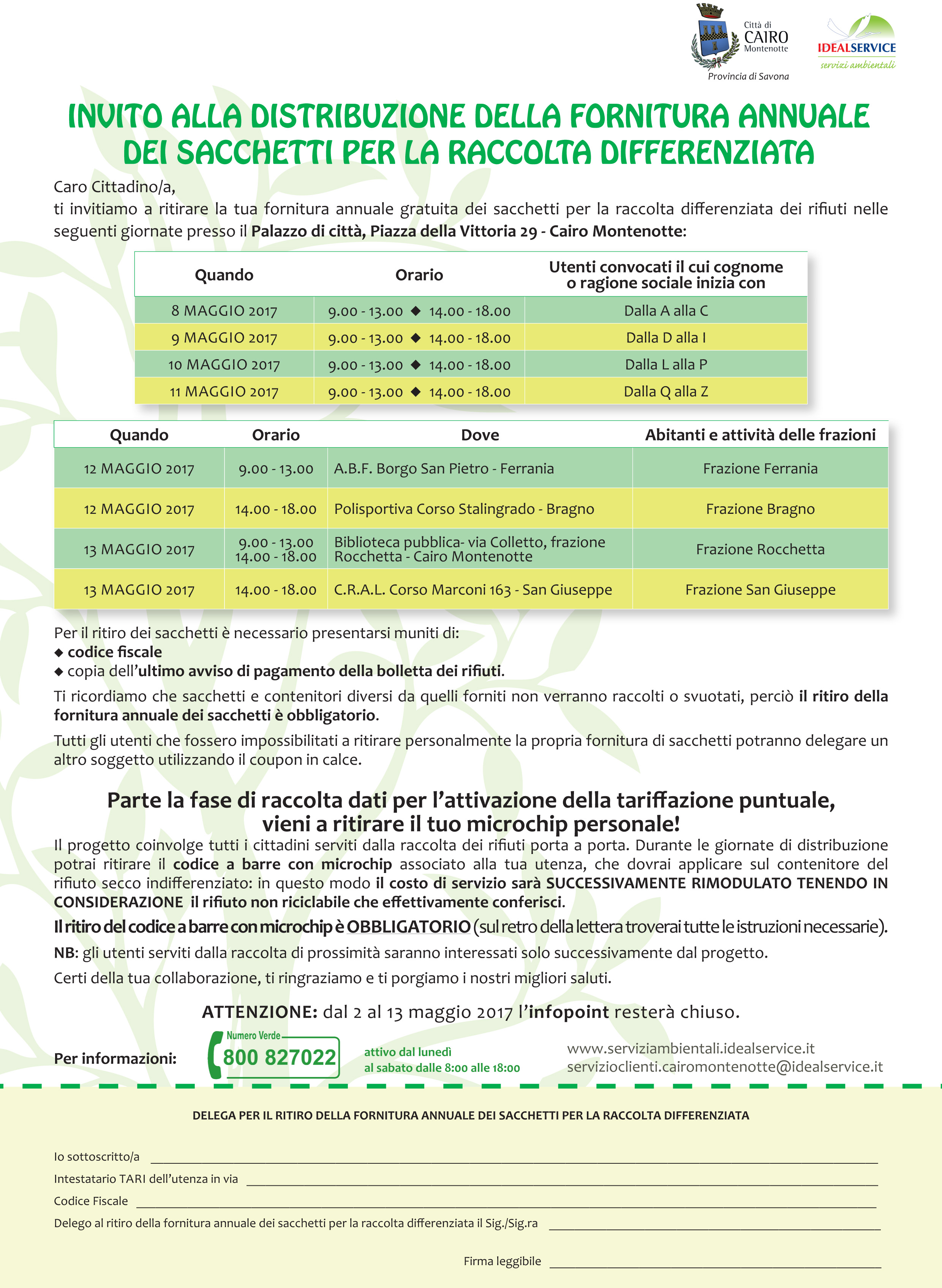 Nel periodo dal 08 al 13 maggio 2017 la ditta Ideal Service, che gestisce il servizio di raccolta differenziata sul territorio del Comune di Cairo, provvederà alla distribuzione della fornitura annuale gratuita dei sacchetti.
