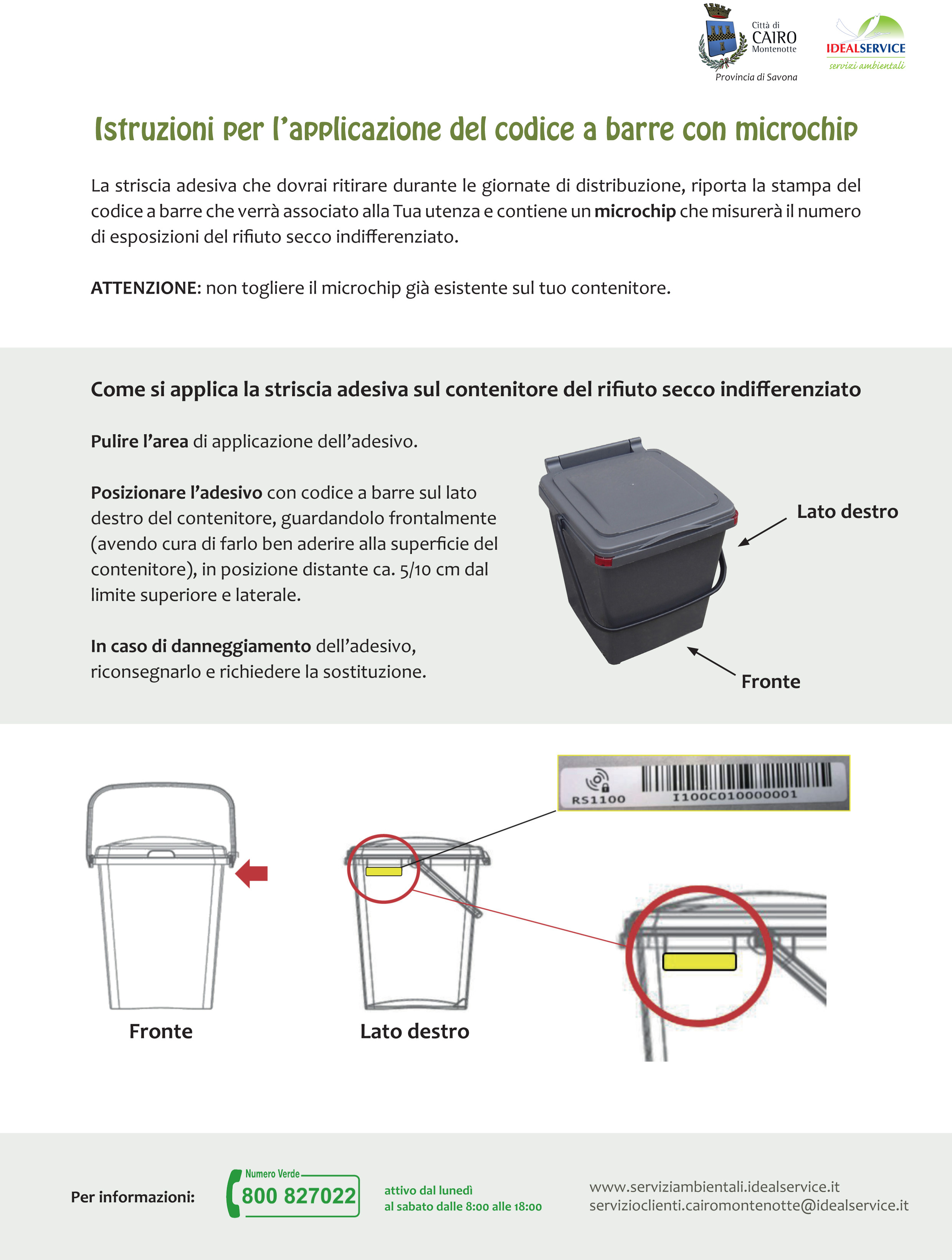 Durante le giornate di distribuzione verrà consegnato un codice a barre con microchip associato all’utenza, che dovrà obbligatoriamente essere applicato sul contenitore del rifiuto secco indifferenziato (mastello grigio). Con l’introduzione di questa nuova fase di raccolta differenziata, il costo del servizio sarà successivamente rimodulato. Ai due attuali parametri sui quali si effettua il calcolo della Tari, metratura dell'alloggio e numero dei componenti il nucleo famigliare, si aggiungerà l'effettiva produzione di rifiuti non riciclabili effettivamente conferiti: infatti il microchip registrerà in numero di volte che verrà esposto il mastello grigio.
