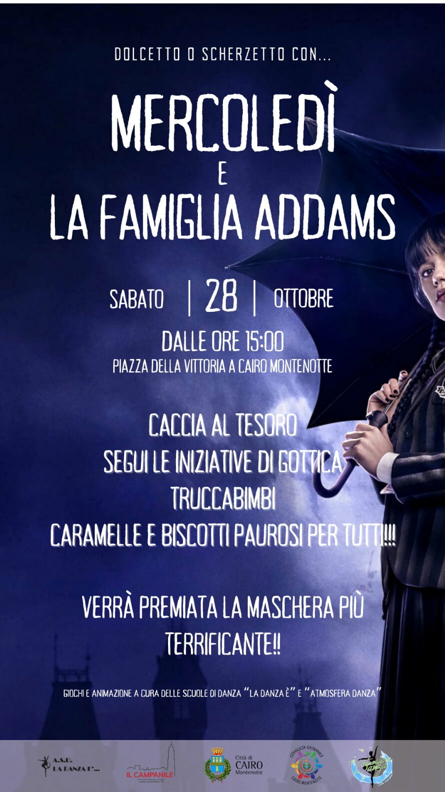 Martedi 31 Ottobre in Piazza della Vittoria la festa di Halloween, che prevederà giochi e animazione a cura delle scuole di danza "Atmosfera Danza" e "La Danza è....", una caccia al tesoro itinerante e la merenda a cura del C.i.v. "Il Campanile"