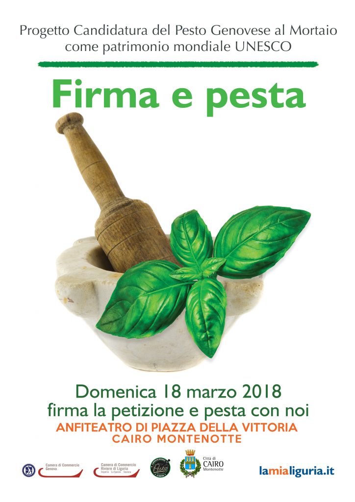 Anche la Città di Cairo Montenotte partecipa alla giornata evento, nella settimana dedicata a Sua Maestà il Pesto, nel corso della quale sarà possibile firmare per sostenere la candidatura del Pesto Genovese quale patrimonio culturale immateriale dell’umanità. Essa riguarda la salvaguardia dell’antica tecnica del mortaio e del suo valore storico e sociale e, utilizzando il proprio mortaio e pestello, e il kit di  ingredienti messo a disposizione dagli organizzatori, preparare un buonissimo Pesto.