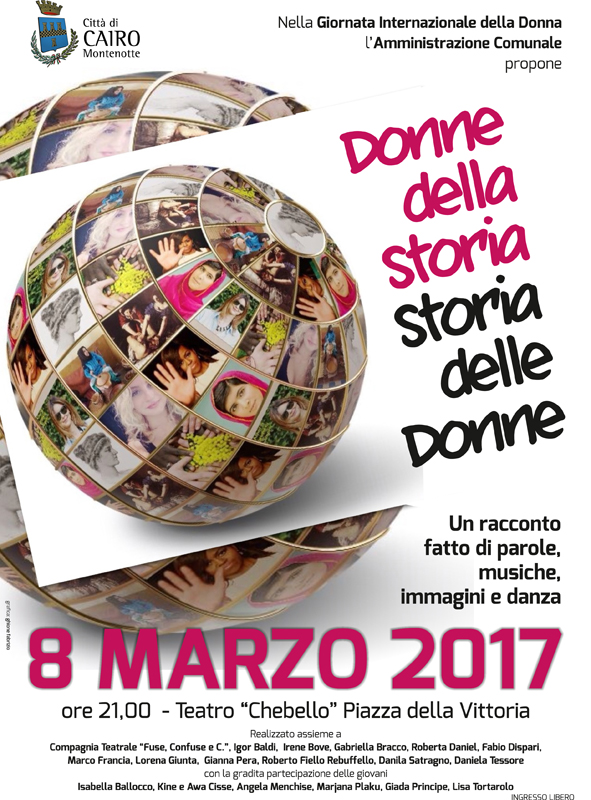 Mercoledì 8 marzo, l'Amministrazione comunale di Cairo Montenotte celebra la Giornata Internazionale della Donna con lo spettacolo "Donne della storia, storia delle Donna", allestito presso il Teatro Comunale "Chebello" alle ore 21,00. L'ingresso è libero. La cittadinanza è invitata a partecipare.