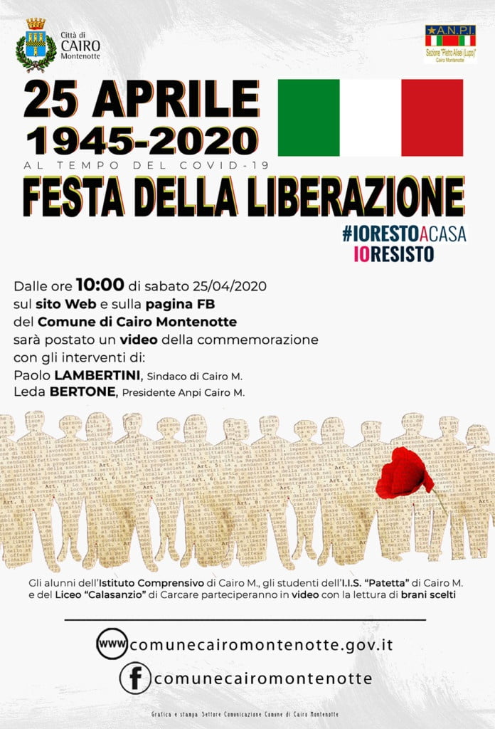 Per dare modo a tutta la Comunità cairese di partecipare alla ricorrenza della Festa della Liberazione, dalle ore 10:00 di sabato 25 aprile 2020 saranno visualizzabili sul sito istituzionale e su questa pagina Facebook del Comune di Cairo Montenotte, gli interventi video del Sindaco Paolo Lambertini e della professoressa Leda Bertone, Presidente della Sezione ANPI “Pietro Alisei (Lupo)”.
