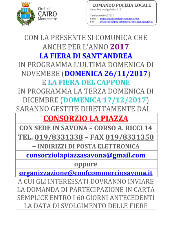 Anche per l’anno 2017 la Fiera di Sant’Andrea in programma l’ultima domenica di novembre (il 26/11/2017) e la Fiera del Cappone in programma la terza domenica di dicembre (il 17/12/2017) saranno gestite direttamente dal Consorzio La Piazza di Savona sulla base della convenzione stipulata con il Comune ai sensi della deliberazione della Giunta Comunale nr 126/2017. Per partecipare occorre inviare al Consorzio la domanda di partecipazione in carta semplice entro i 60 giorni antecedenti la data di svolgimento delle fiere.