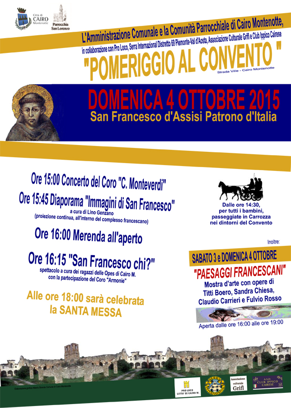 Causa maltempo, il programma subisce le seguenti variazioni: - vengono trasferiti nella Chiesa Parrocchiale di Via Buffa il Concerto del Coro “Monteverdi, lo spettacolo dei ragazzi delle Opes e, a seguire, la celebrazione della Santa Messa; - vengono annullate la diaporama e la merenda all'aperto. Il convento nel pomeriggio del 4 sarà accessibile per la visita alla Mostra “Paesaggi Francescani” che sarà inaugurata sabato 3 alle 16 (essendo allestita all’interno).