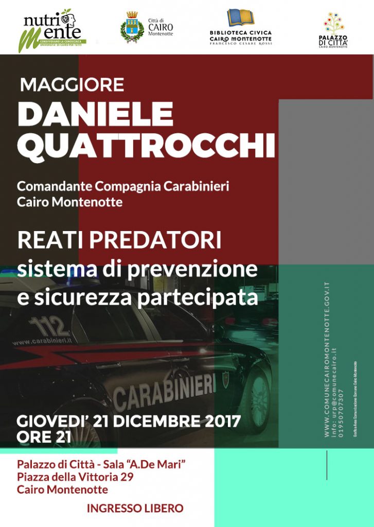 Giovedì 21 dicembre 2017, alle ore 21,00, presso la Sala "A. De Mari" di Palazzo di Città, il Maggiore Daniele Quattrocchi, Comandante della Compagnia Carabinieri di Cairo, parlerà di "Reati predatori" e sistema di prevenzione e sicurezza partecipata. L'ingresso è libero.