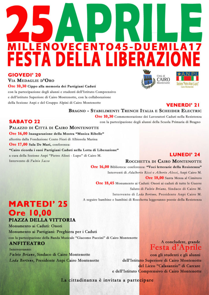 Martedì 25 aprile 2017 si concluderanno, con la “Festa d’Aprile”, in Piazza della Vittoria, le celebrazioni per il 72° anniversario della Liberazione. Sabato 22 inaugurazione della Mostra “Musica Ribelle”. Il programma completo.