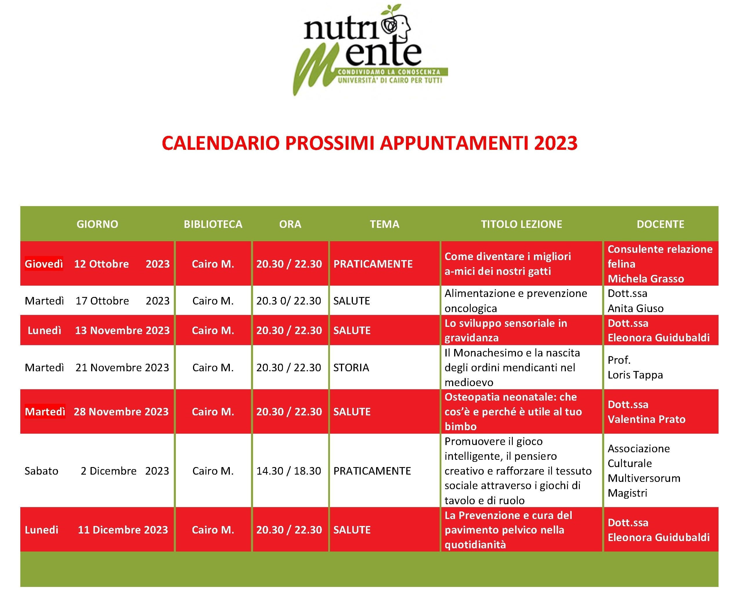 Per partecipare ai corsi a numero chiuso, è necessario essere iscritti ai servizi di prestito bibliotecario mediante il tesseramento annuale. Per alcuni corsi particolari, come quelli che prevedono l'uso o il consumo di prodotti, è previsto il versamento di una quota, il cui importo sarà quantificato prima dell'inizio degli stessi così come le modalità di versamento. Iscrizioni e informazioni: Biblioteca Civica "F.C. Rossi" di Palazzo Scarampi - Via Ospedale Baccino 28 dal lunedì al sabato 9.00-12.0 e 14.30 - 18.00 Telefono: 019504533 biblioteca@comunecairo.it