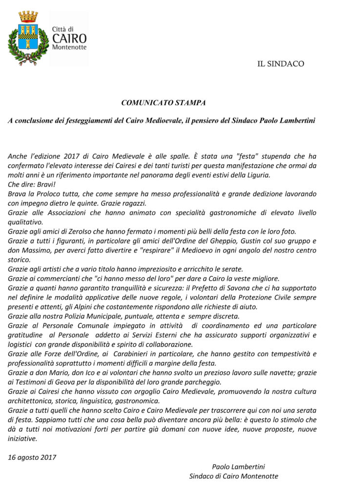 A conclusione dei festeggiamenti del Cairo Medioevale, il Sindaco Paolo Lambertini esprime il proprio ringraziamento a tutti quanti si sono prodigati per il successo della manifestazione, che da molti anni è un riferimento importante nel panorama degli eventi estivi della Liguria. "Grazie ai Cairesi che hanno vissuto con orgoglio Cairo Medievale, promuovendo la nostra cultura architettonica, storica, linguistica, gastronomica".