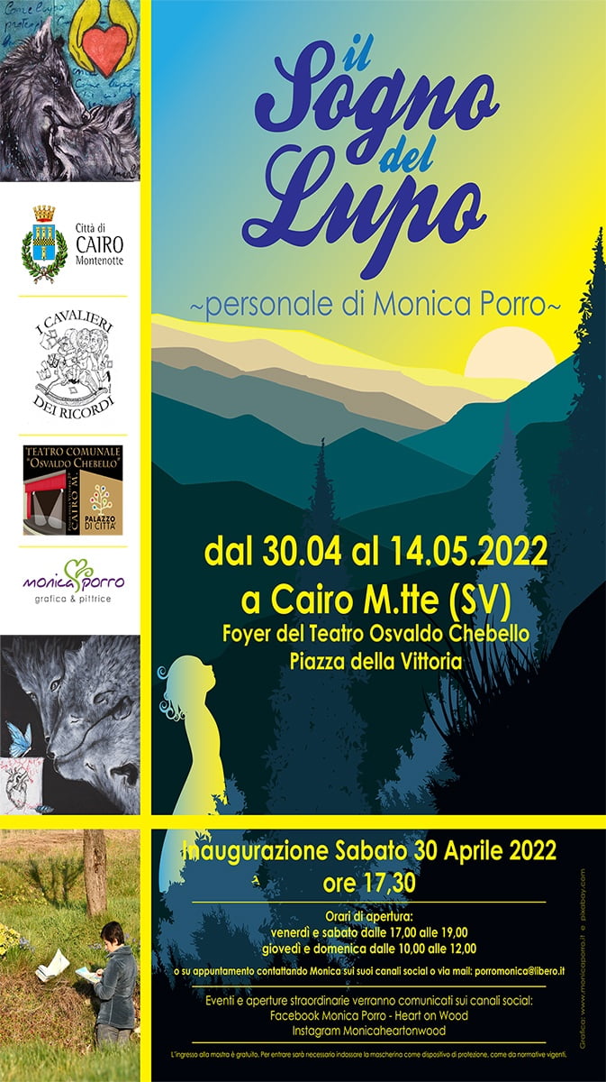 L'artista, grafica e pittrice, Monica Porro inaugurerà la sua mostra personale dal titolo "Il sogno del lupo", presso il foyer del Teatro Comunale "Osvaldo Chebello", sabato 30 aprile 2022 alle ore 17:30. Le opere resteranno in esposizione fino a sabato 14 maggio 2022, gli orari di apertura saranno: venerdì e sabato ore 17:00-19:00, giovedì e domenica ore 10:00-12:00.