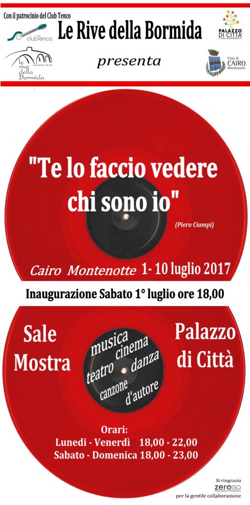 Con l’esposizione “Te lo faccio vedere chi sono io” vengono raccontate, attraverso le immagini, le storie dei tanti talenti di ieri e di oggi che hanno in qualche modo avuto a che fare con il nostro territorio, storie sconosciute a molti di noi, che pure hanno pieno diritto d’essere ricordate. Un’altra sezione della mostra è dedicata alle immagini di Ciampi e di Panseri, insieme ad un’ ampia carrellata di fotografie che ritraggono dei giovanissimi Guccini, Vecchioni, Finardi, Branduardi, Pietrangeli, Gianna Nannini e tanti altri, sul palco del teatro Ariston di Sanremo. L’Associazione Fotografica “ZeroIso” ha reinterpretato storiche copertine di leggendari 33 giri, ambientandole in Valle o con personaggi di Cairo Montenotte e della Valle Bormida. Sono esposti alcuni strumenti per la riproduzione dei suoni come si sono evoluti nel tempo e qualche strumento musicali.