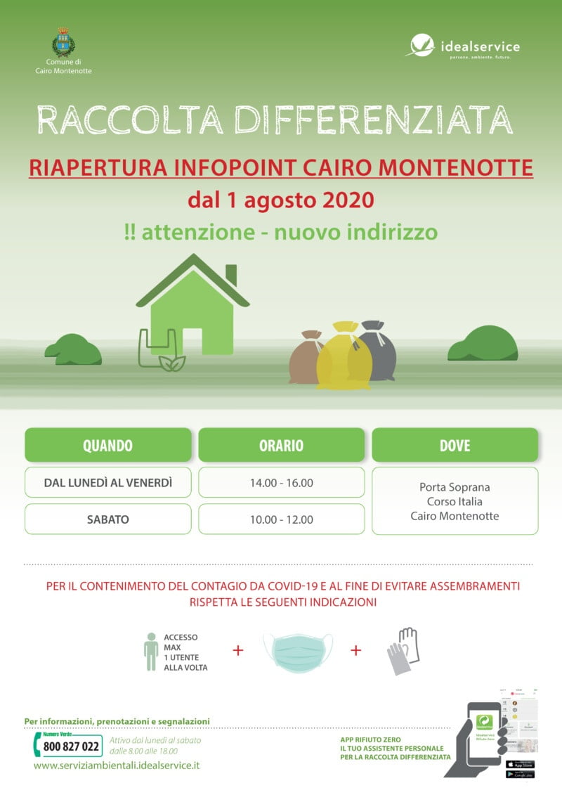 L'Infopoint di Idealservice è nuovamente in funzione presso l’ufficio di Porta Soprana in Corso Italia, con apertura dal lunedì al venerdì dalle 14 alle 16 e il sabato dalle 10 alle 12, al quale potranno rivolgersi anche gli utenti che non hanno richiesto la consegna porta a porta delle attrezzature.