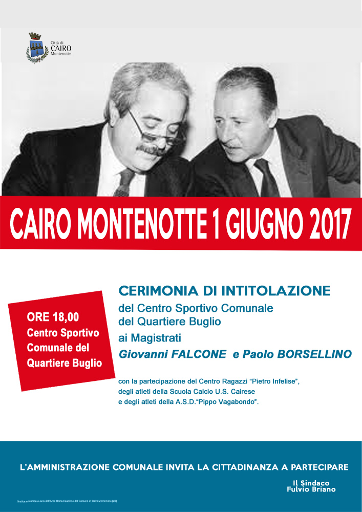 Giovedì 1 giugno 2017, alle ore 18,00, si svolgerà la cerimonia di intitolazione del Centro Sportivo Comunale del quartiere Buglio di Cairo Montenotte al Magistrati Giovanni Falcone e Paolo Borsellino.
