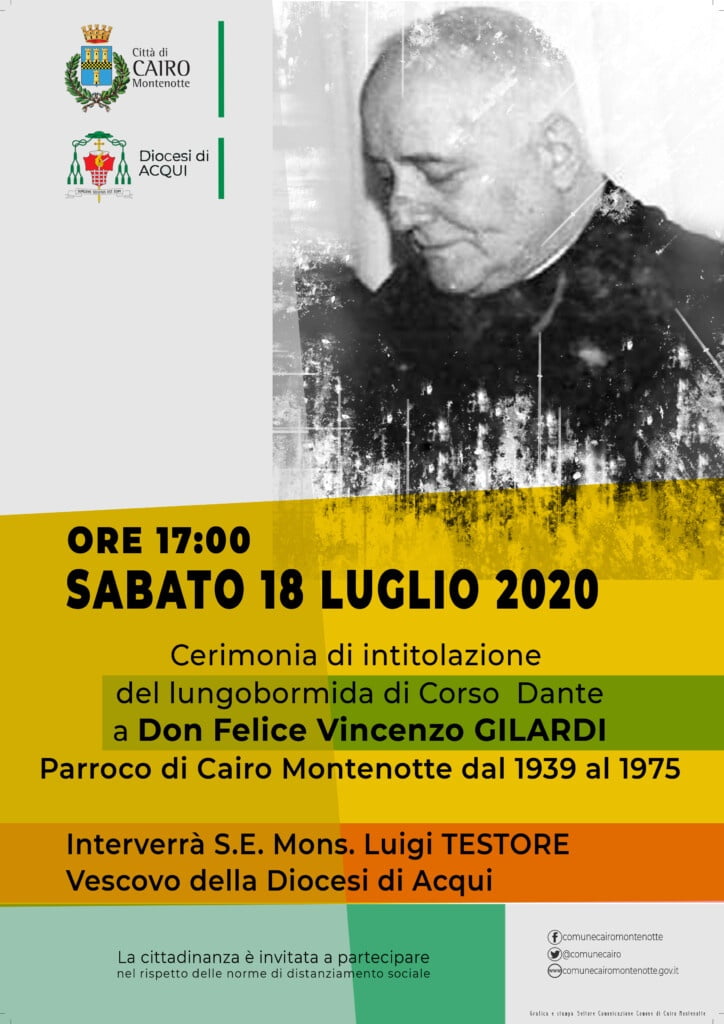 Sabato 18 luglio 2020 alle ore 17:00 si terrà la cerimonia di intitolazione al Parroco Don Felice Vincenzo Gilardi, per 36 anni arciprete della Parrocchia di San Lorenzo, del percorso pedonale che in Corso Dante costeggia il Fiume Bormida.
