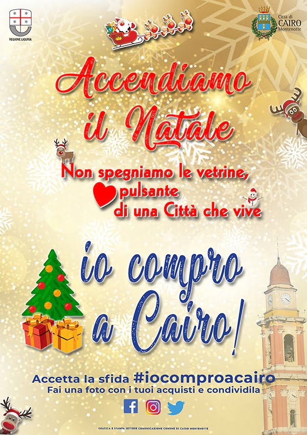 “Sosteniamo il commercio nella nostra città! – esorta il Sindaco Paolo Lambertini - La nostra Cairo con le sue vie ampie, con la piazza principale che tornerà ancora più bella e vivace, con il centro storico vivo e pulsante, con le sue frazioni suggestive e dinamiche, con il vociare fitto delle persone, con i nostri negozi, fatti di luci, di vetrine creative, di profumi, di prodotti unici, ma soprattutto di persone. Persone che sono più che «commercianti»”.