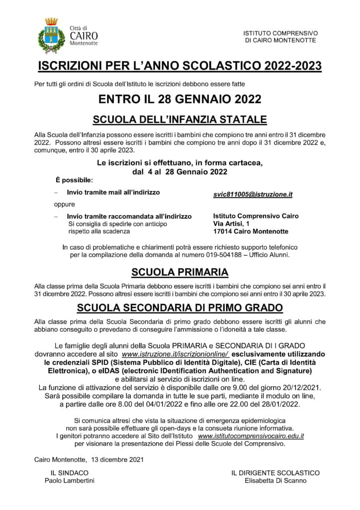 Pubblicato il manifesto indicante le modalità di iscrizione a tutti gli ordini di Scuola dell’Istituto Comprensivo di Cairo Montenotte. Le iscrizioni devono essere fatte entro il 28 gennaio 2022. Leggi qui il manifesto in pdf