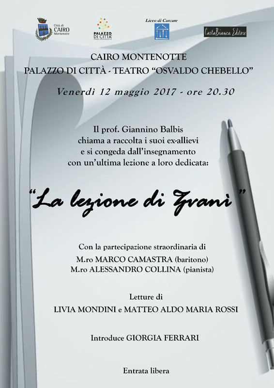 Venerdì 12 maggio, alle ore 20,30 presso il Teatro Comunale “Chebello” a Cairo Montenotte, il prof. Giannino Balbis si congeda dall’insegnamento dedicando un’ultima lezione ai suoi ex allievi: “La lezione di Zvanì”.