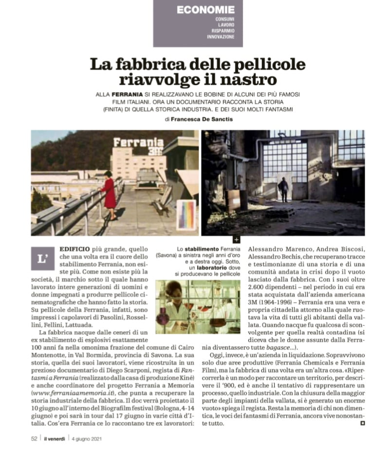 Nel testo si richiama in estrema sintesi l'origine e la storia dell'azienda e si introduce la presentazione del film "Fantasmi a Ferrania", in anteprima a Cairo Montenotte, al Cinema Teatro "Osvaldo Chebello" il 18 giugno alle 20:30, del regista Diego Scarponi, prodotto da Kiné Società Cooperativa di Bologna, già al fianco del Ferrania Film Museum in vari progetti.