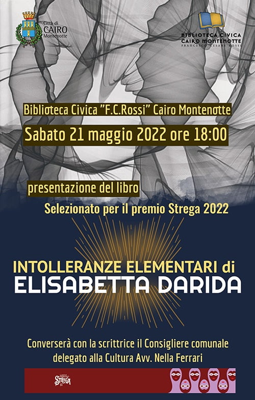 Sabato 21 maggio 2022 alle ore 18:00 la Biblioteca Civica "Francesco Cesare Rossi" ospiterà la presentazione del libro "Intolleranze elementari" di Elisabetta Darida, tra i selezionati per il Premio Strega 2022. Converserà con la scrittrice il Consigliere comunale delegato alla Cultura Avv.Nella Ferrari.