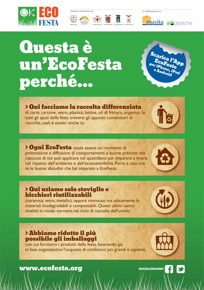 Il marchio “Ecofesta” viene concesso alle manifestazioni che accettano di sottoscrivere un impegno teso a soddisfare una serie di requisiti di base, tra cui: