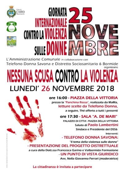 Lunedì 26 novembre 2018, in occasione della Giornata Internazionale contro la violenza sulle donne, l'Amministrazione Comunale, in collaborazione con Telefono Donna e il Distretto Sociosanitario 6 Bormide, propone un'iniziativa di sensibilizzazione verso il femmicidio e la violenza maschile sulle donne.