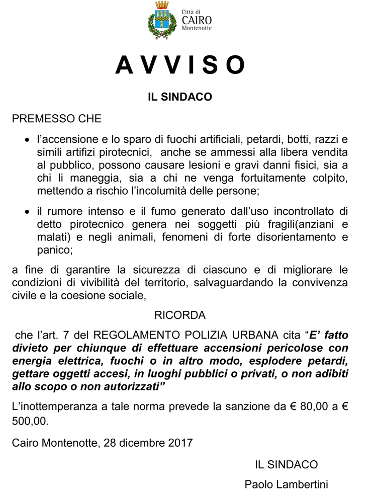 L’articolo 7 del Regolamento di Polizia Urbana – Norme per la civile convivenza in Città prevede il "divieto per chiunque di effettuare accensioni pericolose con energia elettrica, fuochi o in altro modo, esplodere petardi, gettare oggetti accesi, in luoghi pubblici o privati, o non adibiti allo scopo o non autorizzati" al fine di garantire la sicurezza di ciascuno e di migliorare le condizioni di vivibilità del territorio.