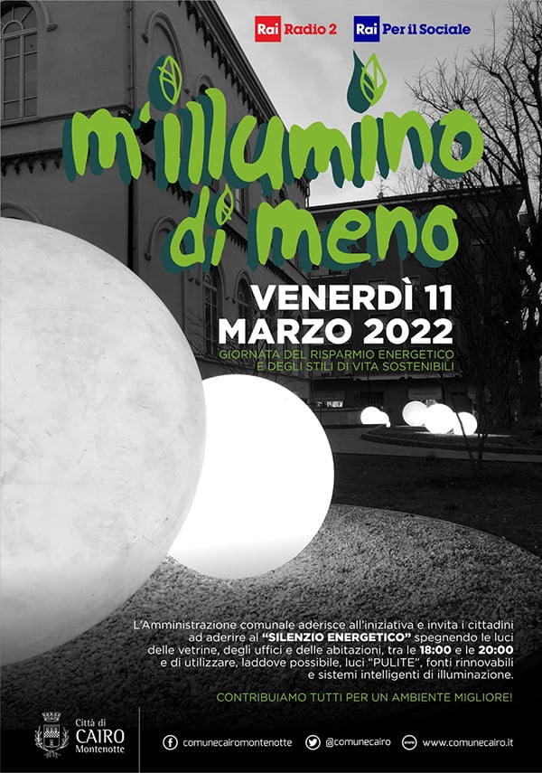 Come ormai tradizione il Comune di Cairo, anche per il 2022, partecipa al “simbolico silenzio energetico” con il semplice gesto di spegnimento della luce, che decine di migliaia di individui, istituzioni, associazioni, negozi hanno già messo in pratica in questi 18 anni di campagna