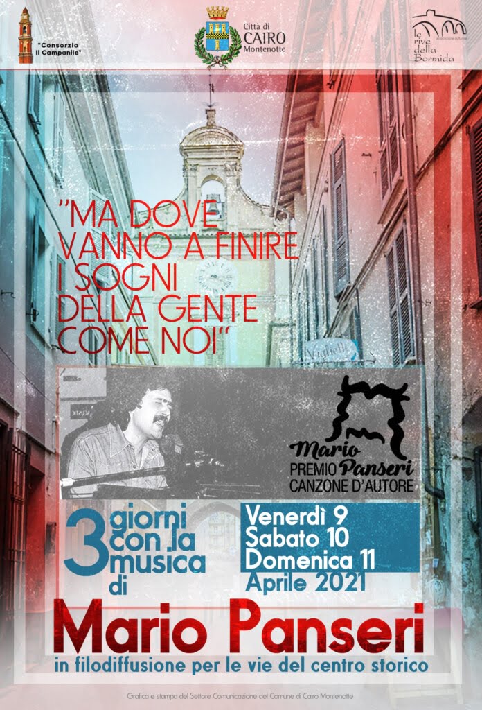 Nei giorni di venerdì 9, sabato 10 e domenica 11 aprile 2021 l’Amministrazione comunale, in collaborazione con il CIV “Il Campanile” e l’Associazione “Le rive della Bormida”, propone, nelle vie del centro storico, tre giorni di musica con le canzoni di Mario Panseri, trasmesse in filodiffusione.