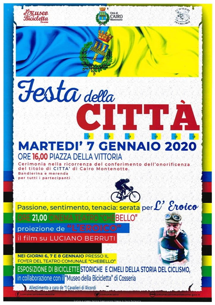 Nella ricorrenza del conferimento dell’onorificenza del titolo di Città a Cairo Montenotte l’Amministrazione Comunale organizza la "Festa della Città", martedì 7 gennaio 2020, in piazza della Vittoria, a partire dalle ore 16.