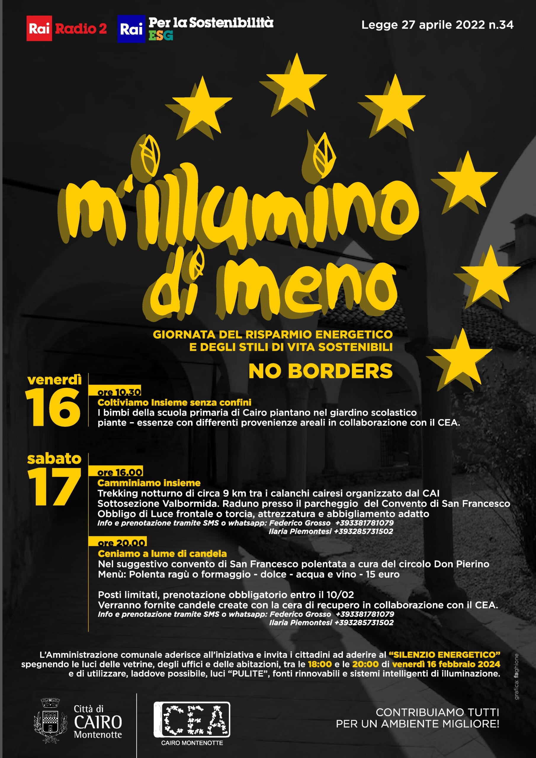 Altre iniziative organizzate per celebrare la Giornata: 16 Febbraio 2024 - ore 10,30 Coltiviamo Insieme senza confini I bimbi della scuola primaria di Cairo piantano nel giardino scolastico piante - essenze con differenti provenienze areali in collaborazione con il CEA 17 Febbraio 2024 - ore 16,00 Camminiamo Insieme Camminata notturna di circa 9 km tra i calanchi cairesi organizzato dal CAI sottosezione Valbormida. Raduno presso il parcheggio del Convento di San Francesco. Obbligo di luce frontale o torcia, attrezzatura e abbigliamento adatto. Info e prenotazione tramite SMS o whatsapp: Federico Grosso 3381781079 - Ilaria Piemontesi 3285731502 17 Febbraio 2024 - ore 20,00 Ceniamo a lume di candela Nel suggestivo convento di San Francesco polentata a cura del circolo Don Pierino Menù: Polenta ragù o formaggio - dolce - acqua e vino - 15 euro Posti limitati, prenotazione obbligatoria entro il 10/02 Verranno fornite candele create con la cera di recupero in collaborazione con il CEA. Info e prenotazione tramite SMS o whatsapp: Federico Grosso 3381781079 - Ilaria Piemontesi 3285731502