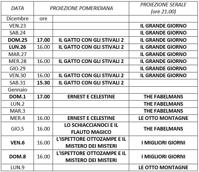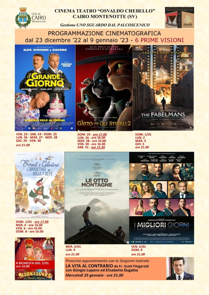 Il film Ernest e Celestine sarà visibile fino al 4 gennaio, alle 16, mentre il film pomeridiano del 6 e dell'8 sarà "L'Ispettore Ottozampe e il Mistero dei Misteri", sempre alle ore 16. [fusion_builder_container hundred_percent="no" hundred_percent_height="no" hundred_percent_height_scroll="no" hundred_percent_height_center_content="yes" equal_height_columns="no" menu_anchor="" hide_on_mobile="small-visibility,medium-visibility,large-visibility" class="" id="" background_color="" background_image="" background_position="center center" background_repeat="no-repeat" fade="no" background_parallax="none" enable_mobile="no" parallax_speed="0.3" video_mp4="" video_webm="" video_ogv="" video_url="" video_aspect_ratio="16:9" video_loop="yes" video_mute="yes" video_preview_image="" border_size="" border_color="" border_style="solid" margin_top="" margin_bottom="" padding_top="" padding_right="" padding_bottom="" padding_left="" admin_toggled="no"][fusion_builder_row][fusion_builder_column type="1_1" layout="1_1" spacing="" center_content="no" link="" target="_self" min_height="" hide_on_mobile="small-visibility,medium-visibility,large-visibility" class="" id="" background_color="" background_image="" background_position="left top" background_repeat="no-repeat" hover_type="none" border_size="0" border_color="" border_style="solid" border_position="all" padding_top="" padding_right="" padding_bottom="" padding_left="" dimension_margin="" animation_type="" animation_direction="left" animation_speed="0.3" animation_offset="" last="no"][fusion_separator style_type="shadow" hide_on_mobile="small-visibility,medium-visibility,large-visibility" class="" id="" sep_color="" top_margin="" bottom_margin="" border_size="" icon="" icon_circle="" icon_circle_color="" width="" alignment="center" /][/fusion_builder_column][/fusion_builder_row][/fusion_builder_container]Calendario proiezioni al cinema "Chebello" di Cairo Montenotte dal 23 dicembre 2022 al 9 gennaio 2023