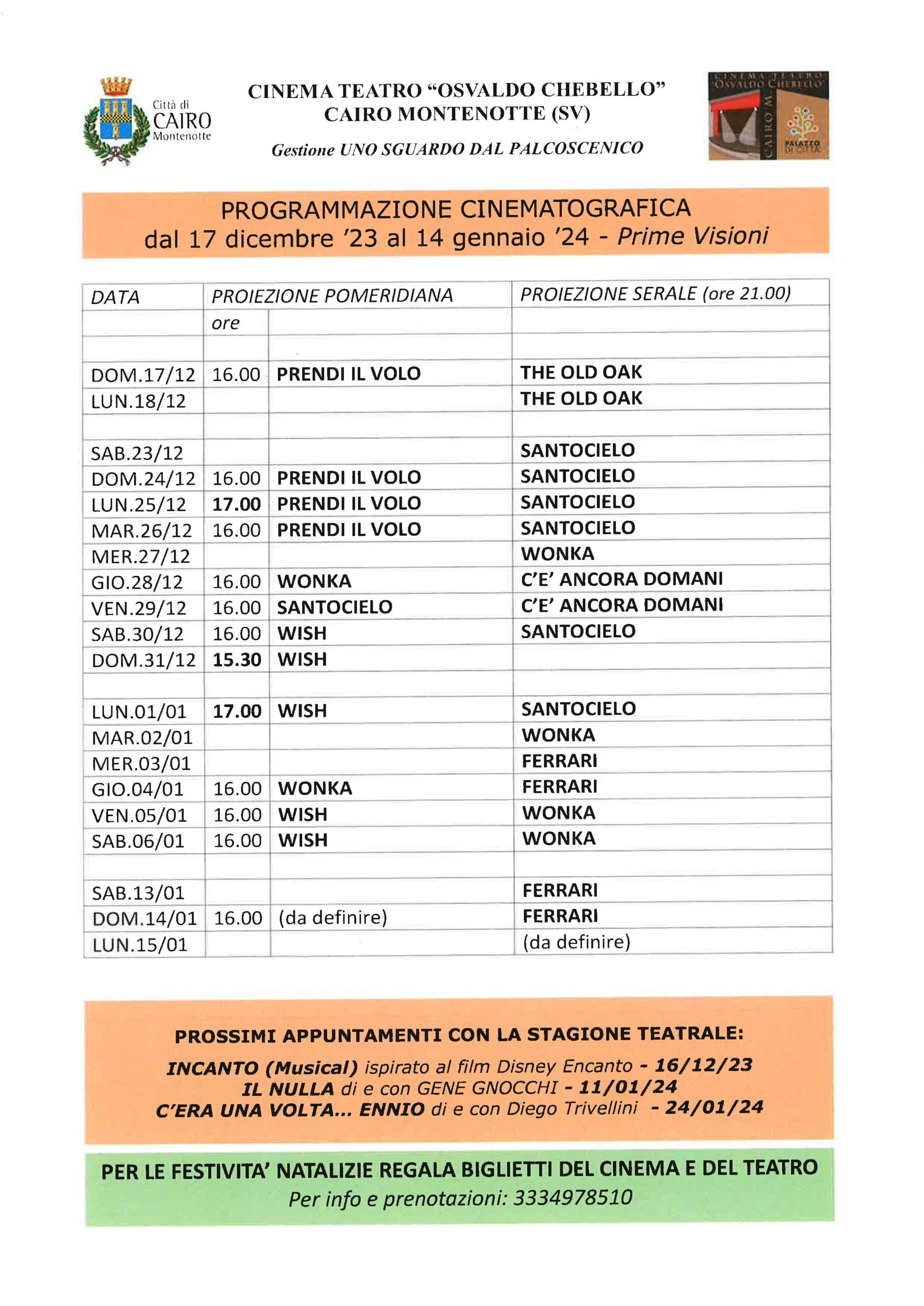 Aggiornamento: Lunedì 8 gennaio alle 21 proiezione serale del film "Wonka"
