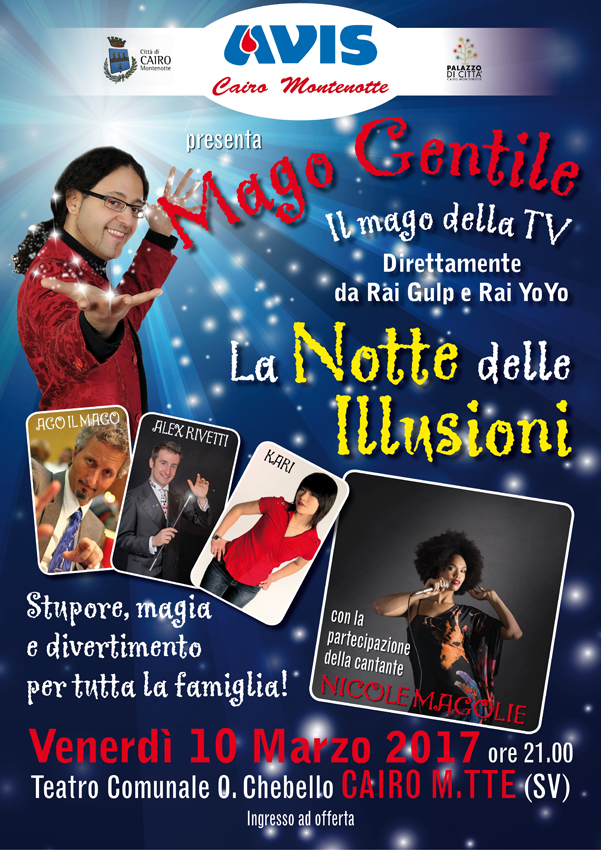 Venerdì 10 marzo nel Teatro Comunale “Chebello”, con inizio alle ore 21,00, l’Avis di Cairo Montenotte, in collaborazione con l’Amministrazione comunale, presenta lo spettacolo di magia “La Notte delle Illusioni”, con la partecipazione di “Mago Gentile” il mago della tv, direttamente da Rai Gulp e Rai Yoyo. La serata di beneficenza è stata organizzata per promuovere la donazione di sangue e propone divertimento per tutta la famiglia, con un spettacolo di magia e illusionismo. Oltre al Mago Gentile, parteciperanno “Ago il Mago”, Alex Rivetti, Kari e la cantante Nicole Magolie. L’ingresso è a offerta