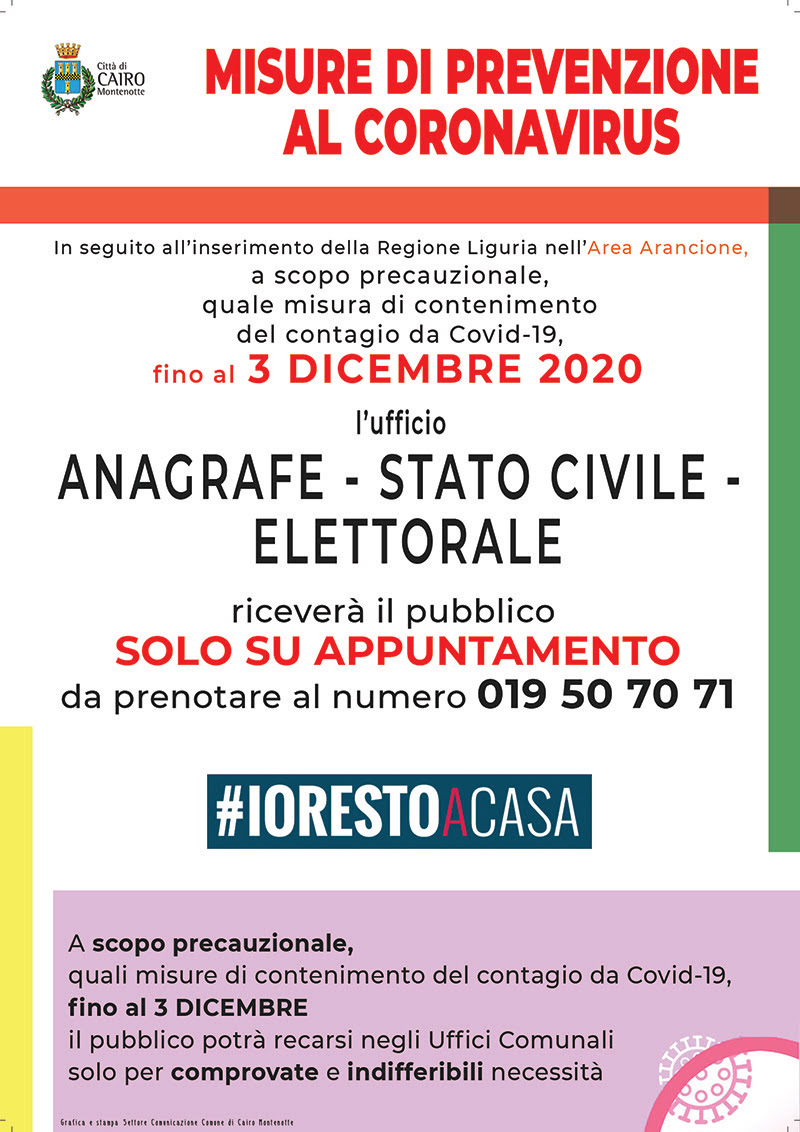 I Servizi Demografici del Comune di Cairo Montenotte sono aperti al pubblico dal lunedì al sabato, dalle ore 9 alle ore 13.