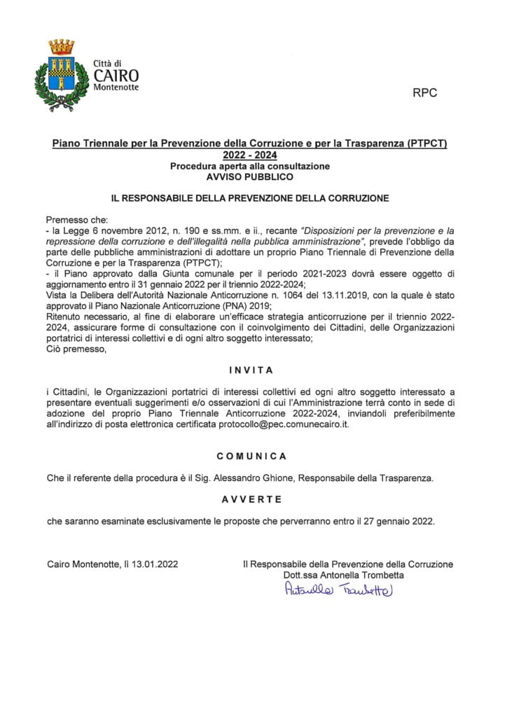 I cittadini, le organizzazioni portatrici di interessi collettivi ed ogni altro soggetto interessato, sono invitati a presentare eventuali suggerimenti e/o osservazioni al Piano Triennale Anticorruzione 2022-2024 entro il 27 gennaio 2022 inviando una PEC a protocollo@pec.comunecairo.it. L'amministrazione ne terrà conto in sede di adozione del proprio Piano.