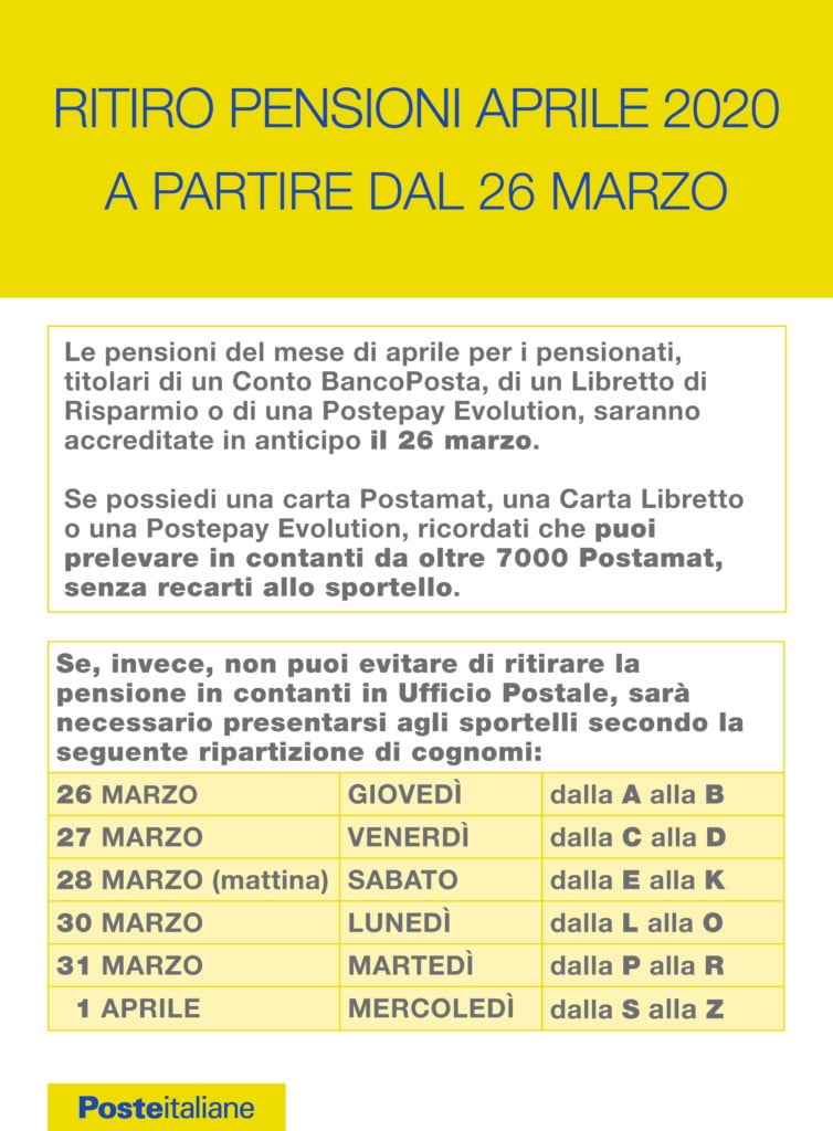 In particolare, considerato che il momento del ritiro della pensione comporta un notevole afflusso di persone agli sportelli, Poste Italiane ha previsto una rimodulazione del servizio per il ritiro delle pensioni di aprile, suddividendolo in più giornate: vai al sito di Poste Italiane per conoscere tutti i dettagli dell'iniziativa