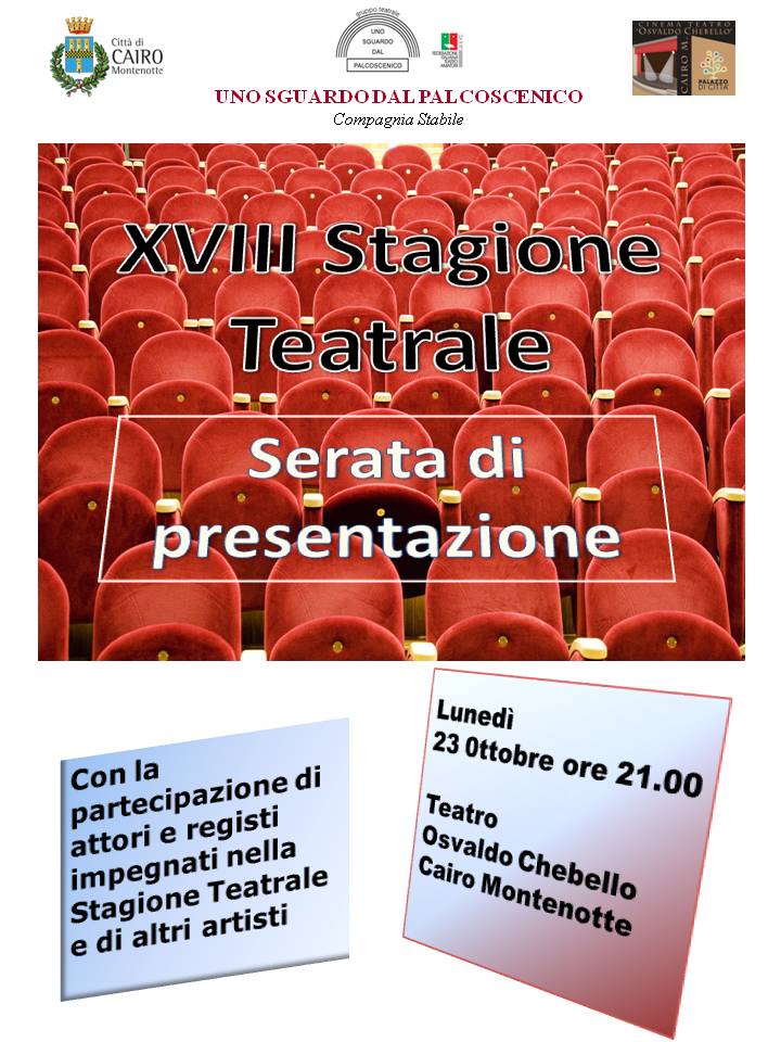 Lunedì 23 ottobre alle ore 21,00 presso il Teatro Comunale “Chebello”, Silvio Eiraldi, Direttore Artistico della Compagnia Teatrale “Uno sguardo dal Palcoscenico” presenterà la nuova Stagione Teatrale 2017/2018. Alla serata di presentazione parteciperanno gli attori, i registri e gli artisti che saranno impegnati negli spettacoli in cartellone.