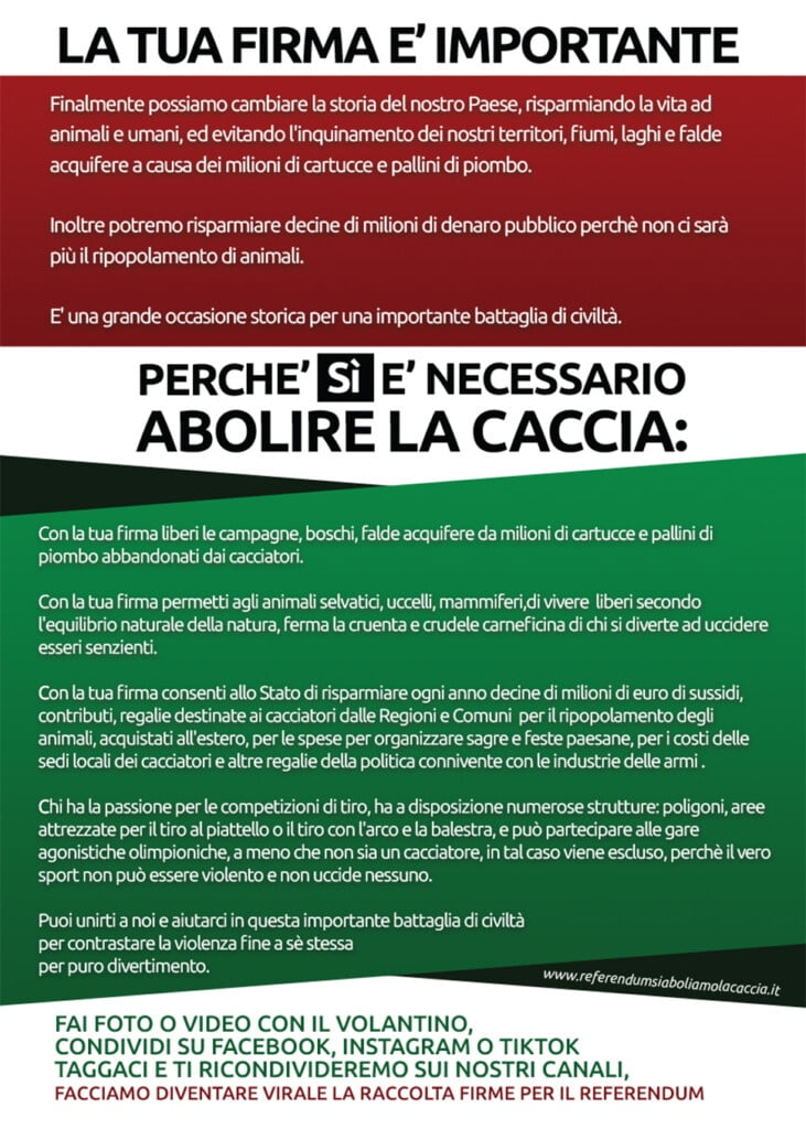 Dal 5 luglio 2021, fino al 20 ottobre 2021 presso l'Ufficio Servizi Demografici, in orario 09:00 - 13:00 dal lunedì al sabato, senza necessità di appuntamento, è possibile firmare la proposta di referendum abrogativo (a cura del Comitato Promotore Referendum Sì Aboliamo la Caccia), riguardante il seguente quesito: leggi qui