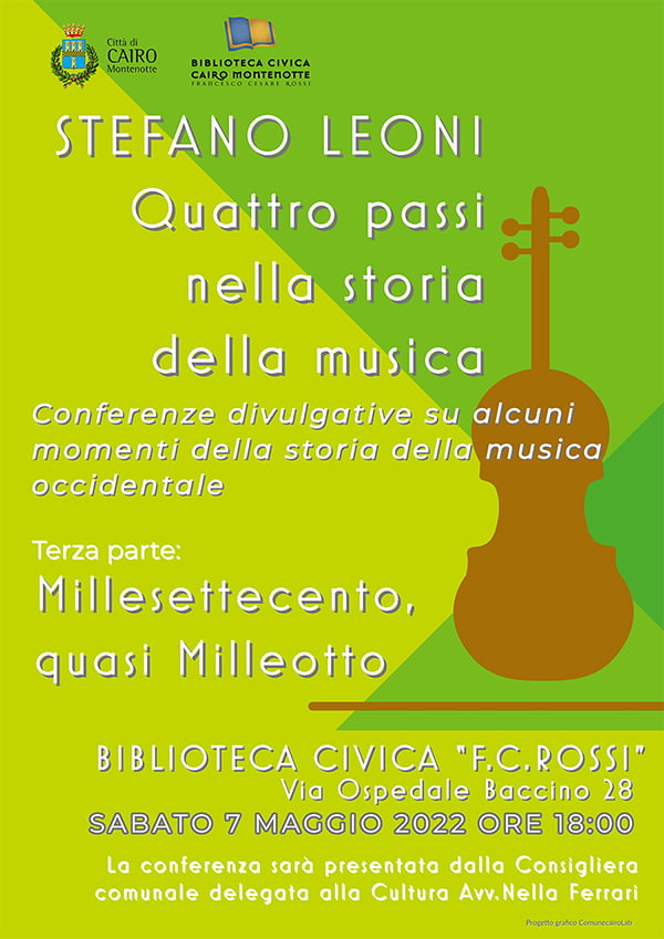 Sabato 7 maggio 2022 alle ore 18:00, la Biblioteca Civica "F.C.Rossi" ospiterà il prof. Stefano Leoni per il terzo appuntamento con: "Quattro passi nella storia della musica", conferenze divulgative su alcuni momenti della storia della musica occidentale.