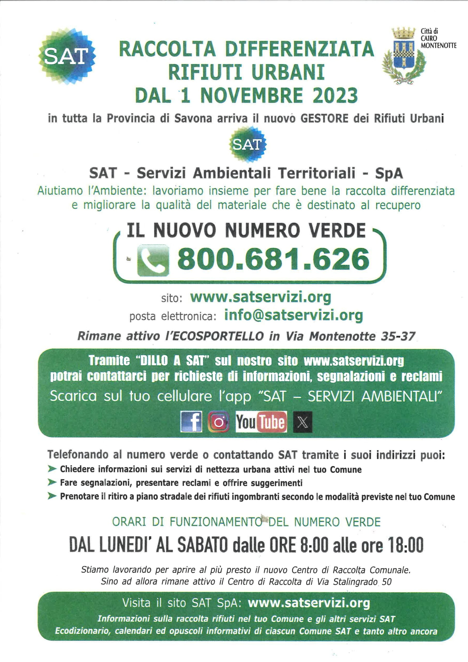 DAL 01 NOVEMBRE 2023 in tutta la provincia di Savona arriva SAT il NUOVO GESTORE della raccolta dei rifiuti urbani.