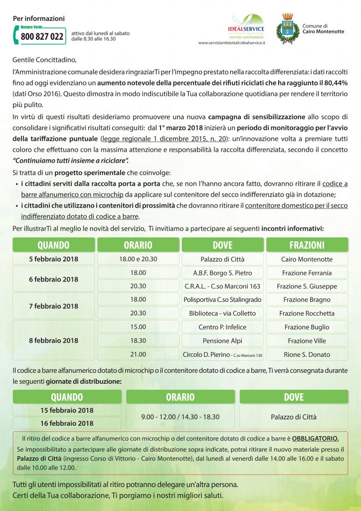 Nei giorni 15 e 16 febbraio 2018, presso il Palazzo di Città, dalle 9 alle 12 e dalle 14,30 alle 18,30, la ditta Ideal Service, distribuirà a tutti gli utenti interessati, il codice a barre con microchip o il contenitore del secco indifferenziato, necessari all’introduzione della tariffazione puntuale.