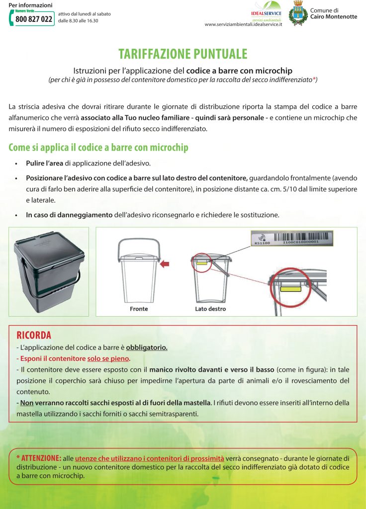 - i cittadini serviti dalla raccolta porta a porta che, se non l’hanno ancora fatto, dovranno ritirare il codice a barre alfanumerico con microchip da applicare sul contenitore del secco indifferenziato già in dotazione;