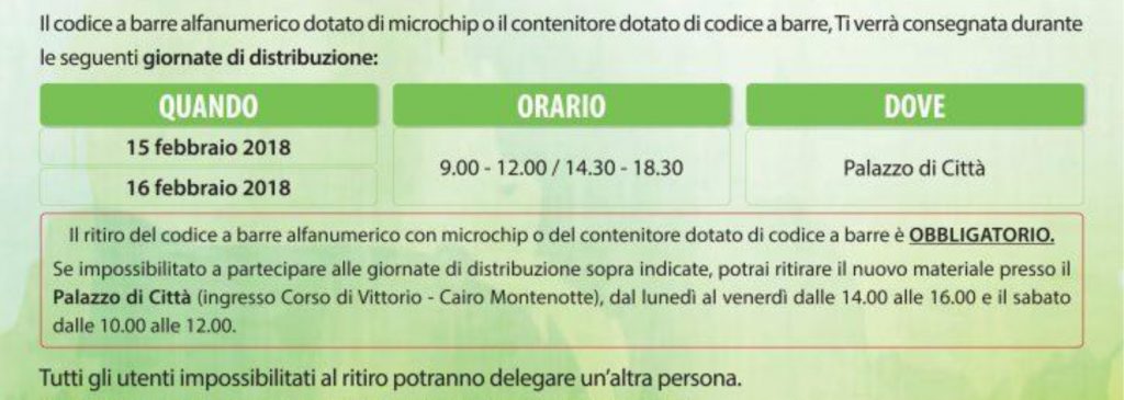 Si ricorda che il ritiro del codice a barre alfanumerico con microchip o del contenitore dotato di codice a barre è OBBLIGATORIO. Tutti gli utenti impossibilitati al ritiro potranno delegare un’altra persona. Se impossibilitato a partecipare alle giornate di distribuzione sopra indicate, potrai ritirare il nuovo materiale presso il Palazzo di Città (ingresso Corso di Vittorio - Cairo Montenotte), dal lunedì al venerdì dalle 14.00 alle 16.00 e il sabato dalle 10.00 alle 12.00.