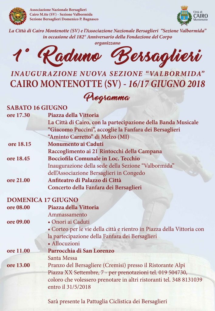 Si svolgerà sabato 16 e domenica 17 giugno 2018 il “1° Raduno Bersaglieri”, organizzato dall'Amministrazione comunale con A.N.B. "Sezione Valbormida" in occasione del 182° Anniversario della Fondazione del Corpo, che vedrà la partecipazione della Fanfara “Aminto Carretto” di Melzo e della Pattuglia Ciclistica dei Bersaglieri.