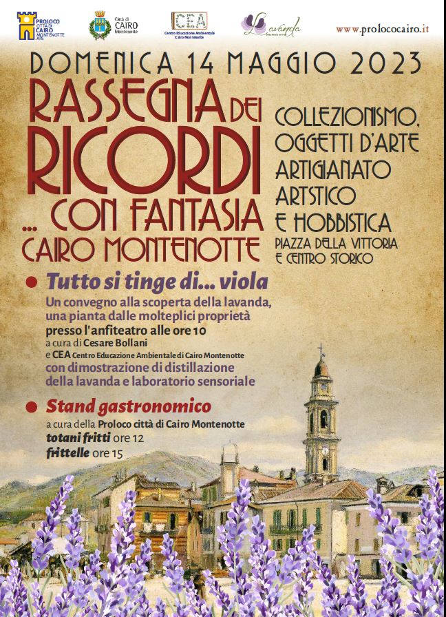 Il 14 maggio, nell'ambito della "Rassegna dei ricordi... con fantasia" organizzata dalla Pro Loco Citta di Cairo Montenotte, si terrà la prima giornata della "Lavanda Riviera dei Fiori un piacere tutto da vivere": per informazioni VAI ALLA NOTIZIA DEDICATA