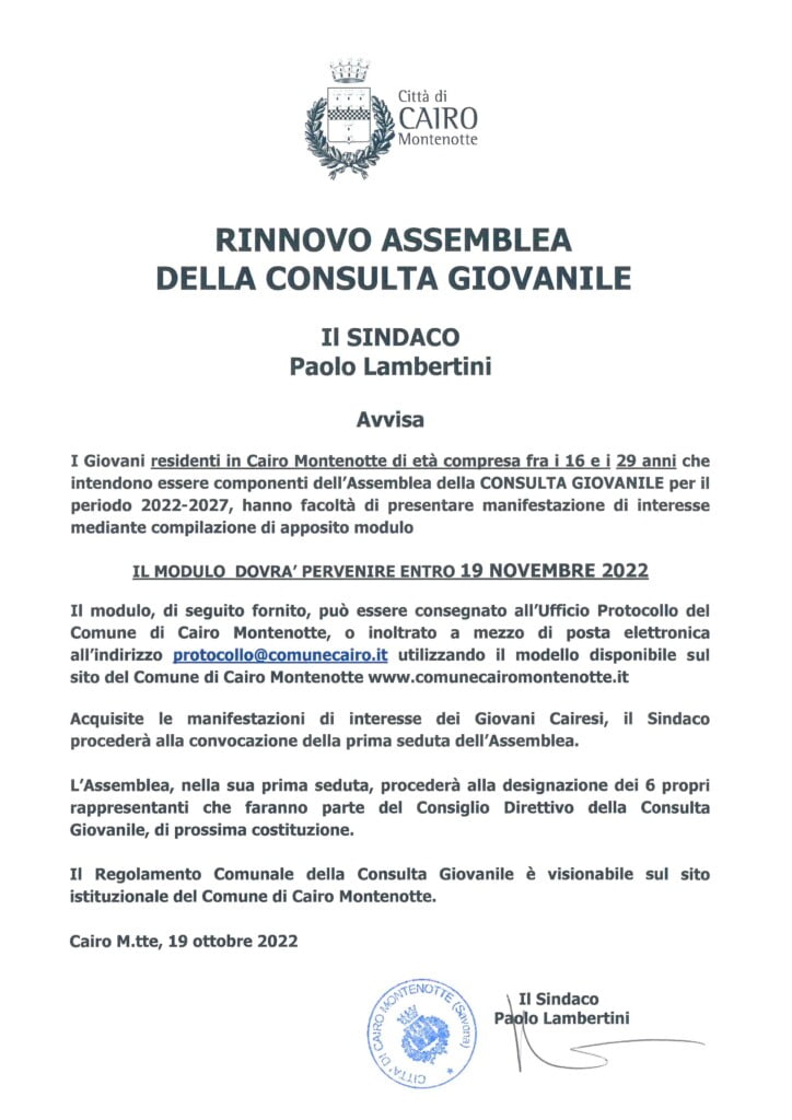 Acquisite le manifestazioni di interesse dei Giovani Cairesi, il Sindaco procederà alla convocazione della prima seduta dell'Assemblea.